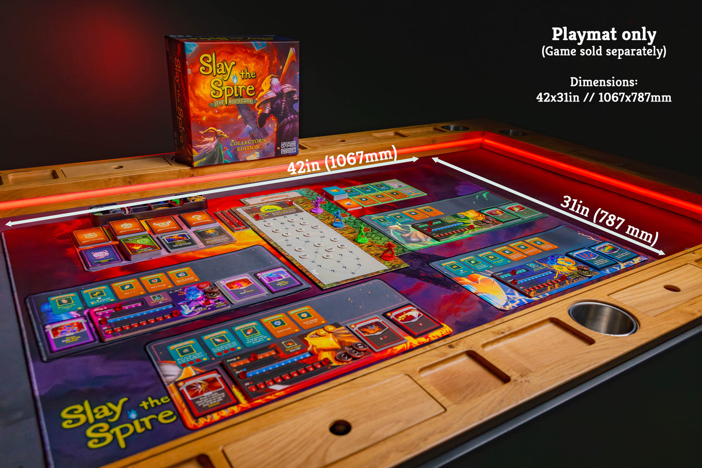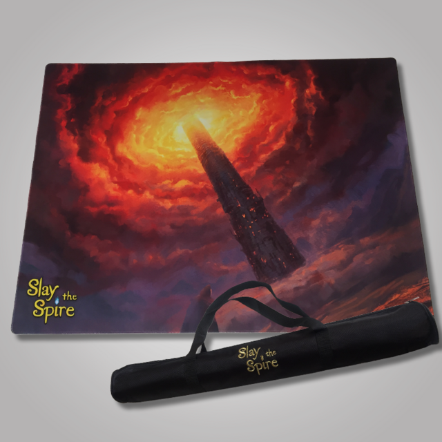 1067x787 mm (42x31 in) Large Table Playmat with stitched edging. Includes a fabric carrying case with stitched Slay the Spire logo.